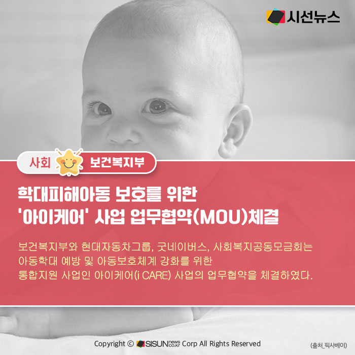보건복지부와 현대자동차그룹, 굿네이버스, 사회복지공동모금회는 아동학대 예방 및 아동보호체계 강화를 위한 통합지원 사업인 아이케어(i CARE) 사업의 업무협약을 체결하였다.