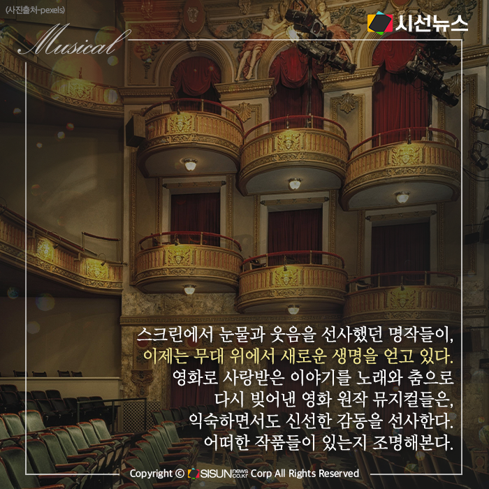 스크린에서 눈물과 웃음을 선사했던 명작들이, 이제는 무대 위에서 새로운 생명을 얻고 있다. 영화로 사랑받은 이야기를 노래와 춤으로 다시 빚어낸 영화 원작 뮤지컬들은, 익숙하면서도 신선한 감동을 선사한다. 어떠한 작품들이 있는지 조명해본다.