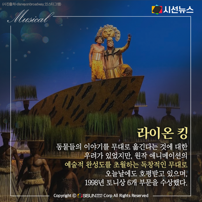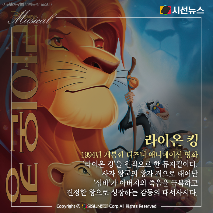 1994년 개봉한 디즈니 애니메이션 영화 ‘라이온 킹’을 원작으로 한 뮤지컬이다. 사자 왕국의 왕자 격으로 태어난 ‘심바’가 아버지의 죽음을 극복하고 진정한 왕으로 성장하는 감동의 대서사시다. 동물들의 이야기를 무대로 옮긴다는 것에 대한 우려가 있었지만, 원작 애니메이션의 예술적 완성도를 초월하는 독창적인 무대로 오늘날에도 호평받고 있으며, 1998년 토니상 6개 부문을 수상했다.