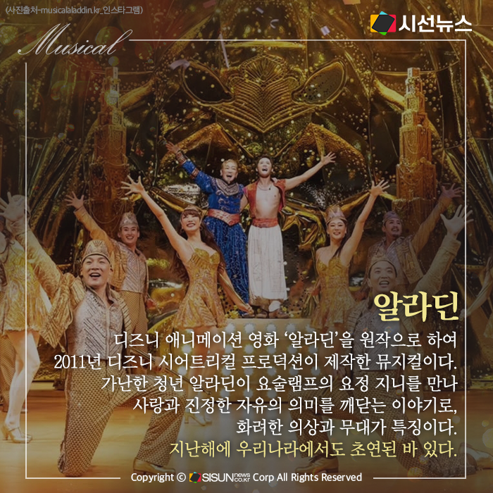 디즈니 애니메이션 영화 ‘알라딘’을 원작으로 하여 2011년 디즈니 시어트리컬 프로덕션이 제작한 뮤지컬이다. 가난한 청년 알라딘이 요술램프의 요정 지니를 만나 사랑과 진정한 자유의 의미를 깨닫는 이야기로, 화려한 의상과 무대가 특징이다. 지난해에 우리나라에서도 초연된 바 있다.
