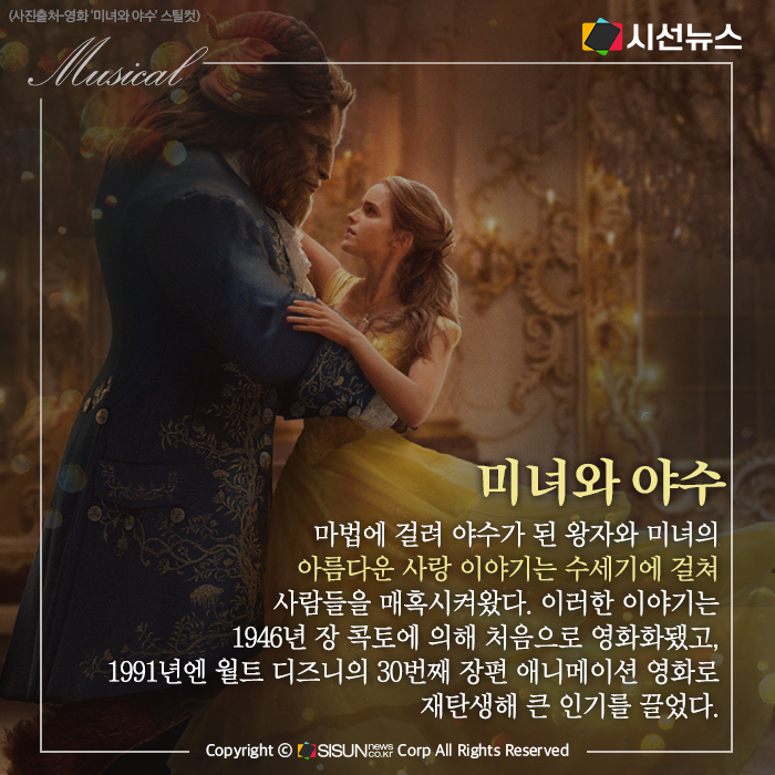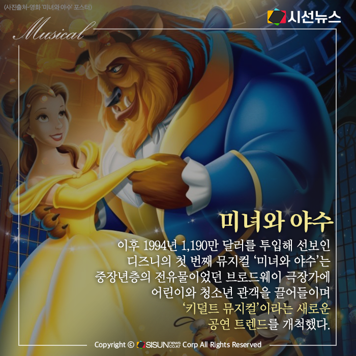 마법에 걸려 야수가 된 왕자와 미녀의 아름다운 사랑 이야기는 수세기에 걸쳐 사람들을 매혹시켜왔다. 이러한 이야기는 1946년 장 콕토에 의해 처음으로 영화화됐고, 1991년엔 월트 디즈니의 30번째 장편 애니메이션 영화로 재탄생해 큰 인기를 끌었다. 이후 1994년 1,190만 달러를 투입해 선보인 디즈니의 첫 번째 뮤지컬 ‘미녀와 야수’는 중장년층의 전유물이었던 브로드웨이 극장가에 어린이와 청소년 관객을 끌어들이며 ‘키덜트 뮤지컬’이라는 새로운 공연 트렌드를 개척했다.