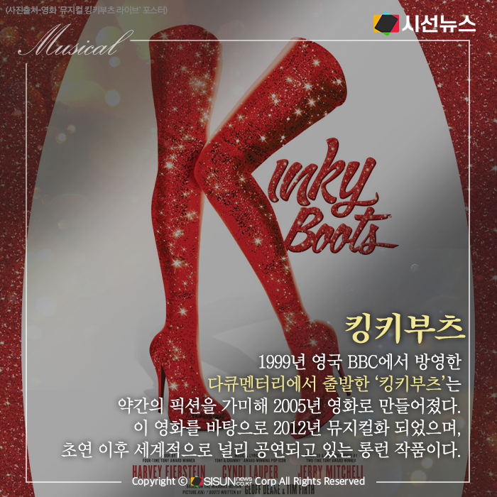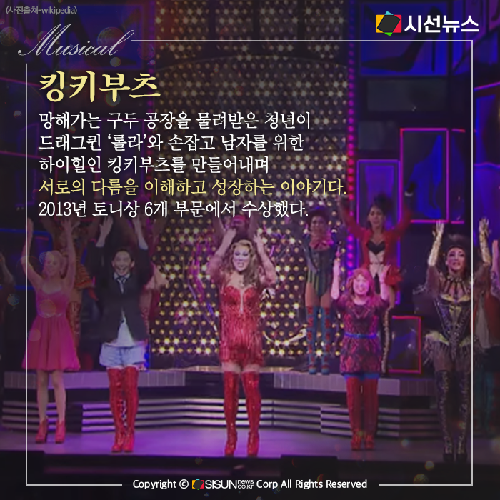 1999년 영국 BBC에서 방영한 다큐멘터리에서 출발한 ‘킹키부츠’는 약간의 픽션을 가미해 2005년 영화로 만들어졌다. 이 영화를 바탕으로 2012년 뮤지컬화 되었으며, 초연 이후 세계적으로 널리 공연되고 있는 롱런 작품이다. 망해가는 구두 공장을 물려받은 청년이 드래그퀸 ‘롤라’와 손잡고 남자를 위한 하이힐인 킹키부츠를 만들어내며 서로의 다름을 이해하고 성장하는 이야기다. 2013년 토니상 6개 부문에서 수상했다.