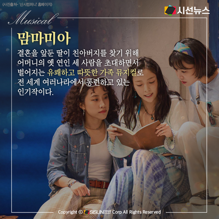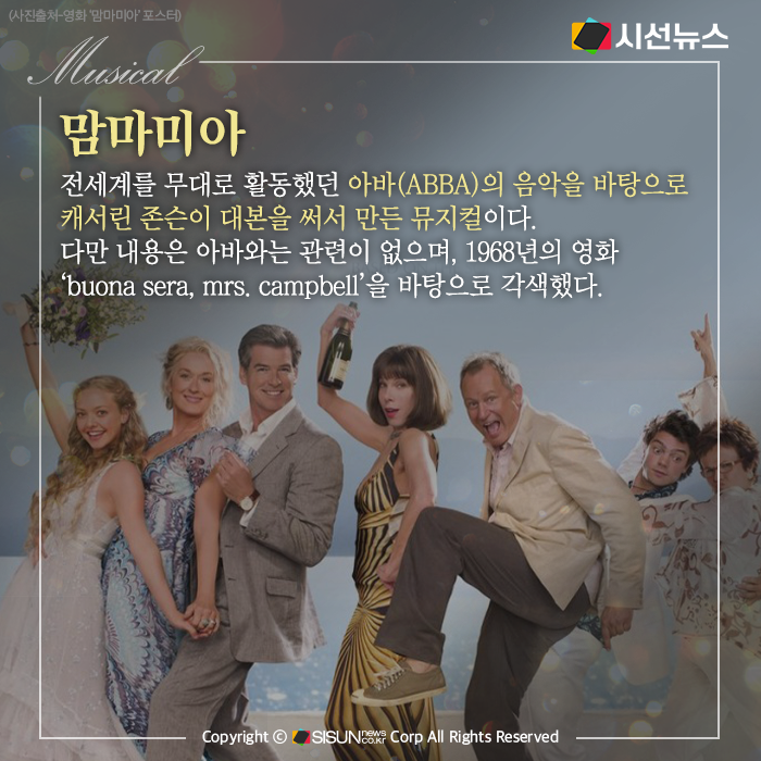 전세계를 무대로 활동했던 아바(ABBA)의 음악을 바탕으로 캐서린 존슨이 대본을 써서 만든 뮤지컬이다. 다만 내용은 아바와는 관련이 없으며, 1968년의 영화 ‘buona sera, mrs. campbell’을 바탕으로 각색했다. 결혼을 앞둔 딸이 친아버지를 찾기 위해 어머니의 옛 연인 세 사람을 초대하면서 벌어지는 유쾌하고 따뜻한 가족 뮤지컬로 전 세계 여러나라에서 롱런하고 있는 인기작이다.