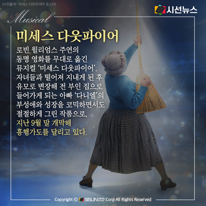 로빈 윌리엄스 주연의 동명 영화를 무대로 옮긴 뮤지컬 ‘미세스 다웃파이어’. 자녀들과 떨어져 지내게 된 후 유모로 변장해 전 부인 집으로 들어가게 되는 아빠 ‘다니엘’의 부성애와 성장을 코믹하면서도 절절하게 그린 작품으로, 지난 9월 말 개막해 흥행가도를 달리고 있다.