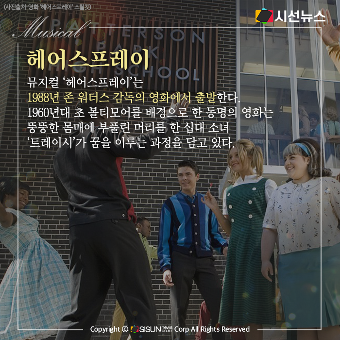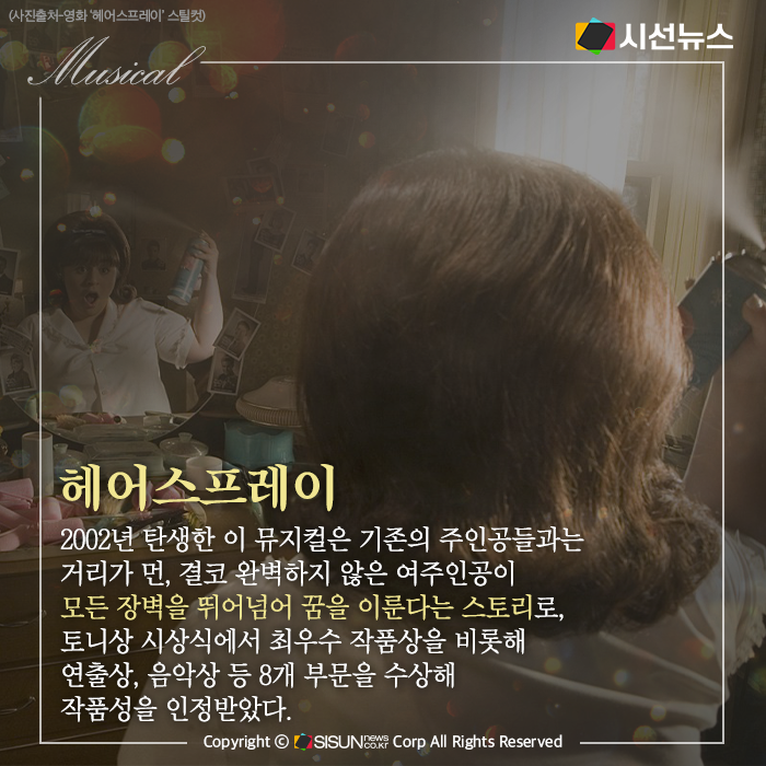 뮤지컬 ‘헤어스프레이’는 1988년 존 워터스 감독의 영화에서 출발한다. 1960년대 초 볼티모어를 배경으로 한 동명의 영화는 뚱뚱한 몸매에 부풀린 머리를 한 십대 소녀 ‘트레이시’가 꿈을 이루는 과정을 담고 있다. 2002년 탄생한 이 뮤지컬은 기존의 주인공들과는 거리가 먼, 결코 완벽하지 않은 여주인공이 모든 장벽을 뛰어넘어 꿈을 이룬다는 스토리로, 토니상 시상식에서 최우수 작품상을 비롯해 연출상, 음악상 등 8개 부문을 수상해 작품성을 인정받았다.