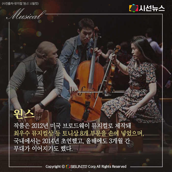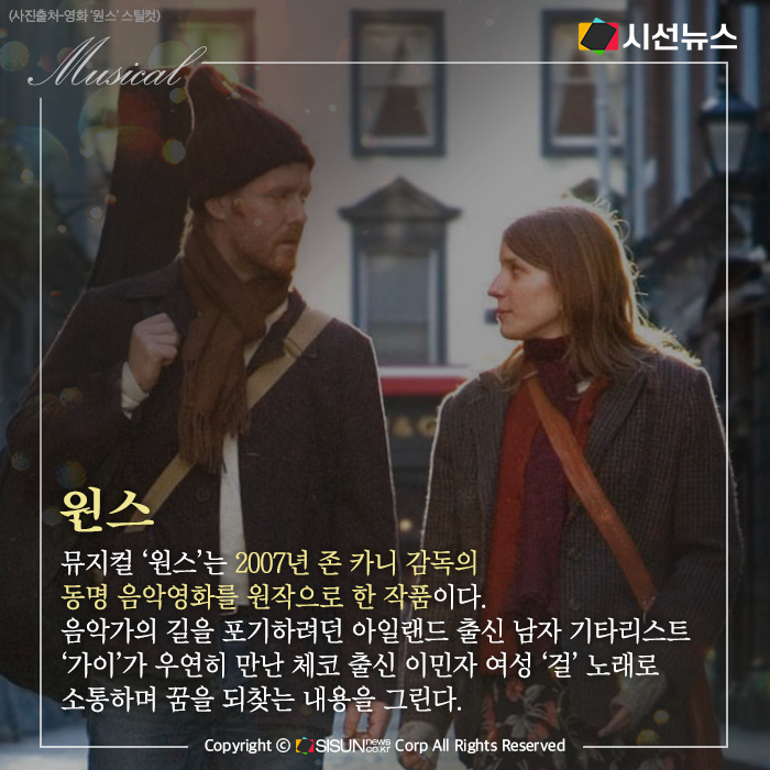 뮤지컬 ‘원스’는 2007년 존 카니 감독의 동명 음악영화를 원작으로 한 작품이다. 음악가의 길을 포기하려던 아일랜드 출신 남자 기타리스트 ‘가이’가 우연히 만난 체코 출신 이민자 여성 ‘걸’ 노래로 소통하며 꿈을 되찾는 내용을 그린다. 작품은 2012년 미국 브로드웨이 뮤지컬로 제작돼 최우수 뮤지컬상 등 토니상 8개 부문을 손에 넣었으며, 국내에서는 2014년 초연했고, 올해에도 3개월 간 무대가 이어지기도 했다.