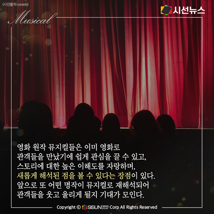 영화 원작 뮤지컬들은 이미 영화로 관객들을 만났기에 쉽게 관심을 끌 수 있고, 스토리에 대한 높은 이해도를 자랑하며, 새롭게 해석된 점을 볼 수 있다는 장점이 있다. 앞으로 또 어떤 명작이 뮤지컬로 재해석되어 관객들을 웃고 울리게 될지 기대가 모인다.