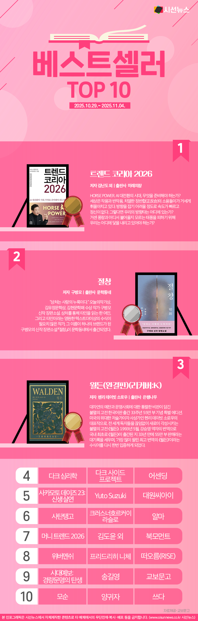 이번 주에는 어떤 책들이 독자들의 사랑을 받았을까요? 교보문고에서 2025년 10월 29일부터 11월 04일까지 영업점과 인터넷에서 도서와 eBook을 합산해 1주일 간 가장 많이 판매된 책 순위를 발표했습니다.