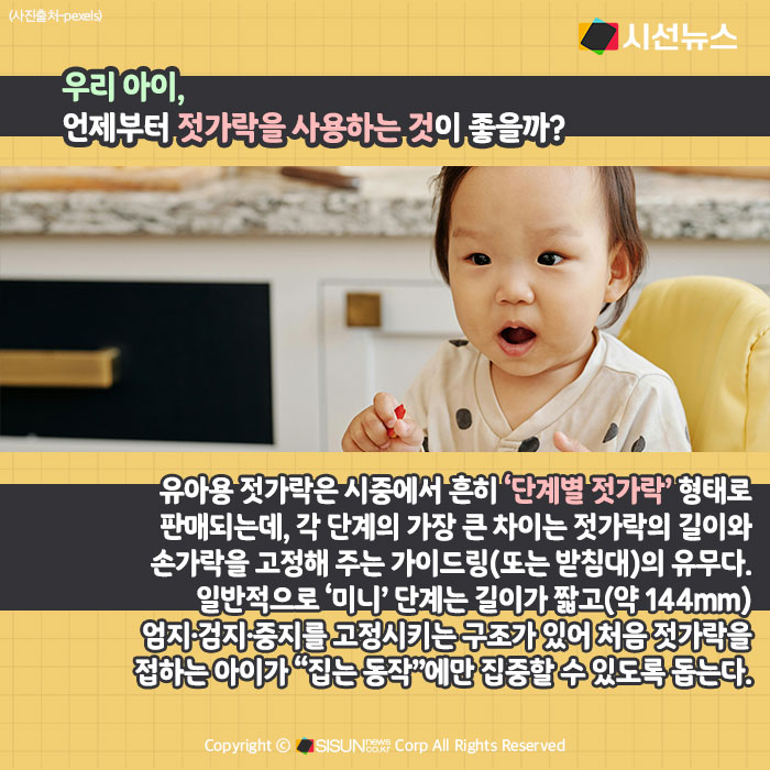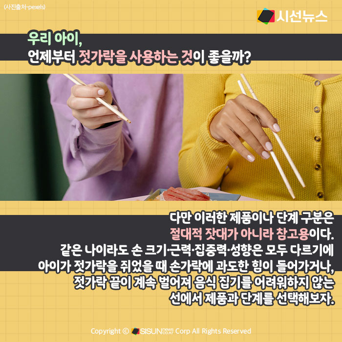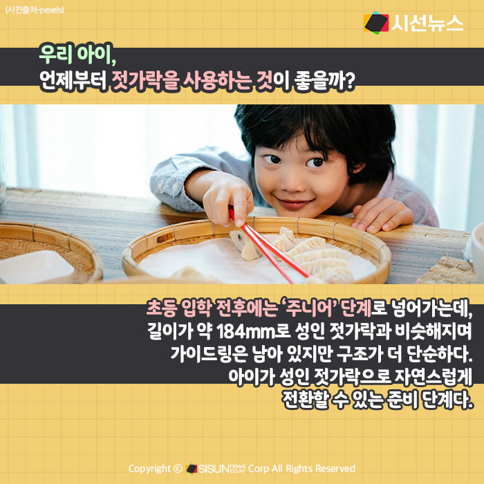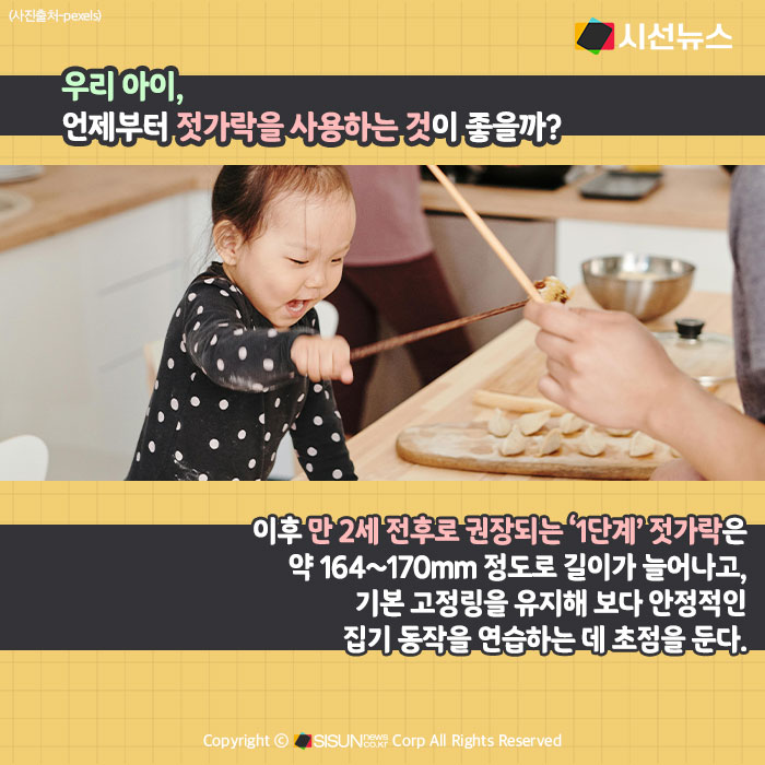 다만 이러한 제품이나 단계 구분은 절대적 잣대가 아니라 참고용이다. 같은 나이라도 손 크기·근력·집중력·성향은 모두 다르기에 아이가 젓가락을 쥐었을 때 손가락에 과도한 힘이 들어가거나, 젓가락 끝이 계속 벌어져 음식 집기를 어려워하지 않는 선에서 제품과 단계를 선택해보자.