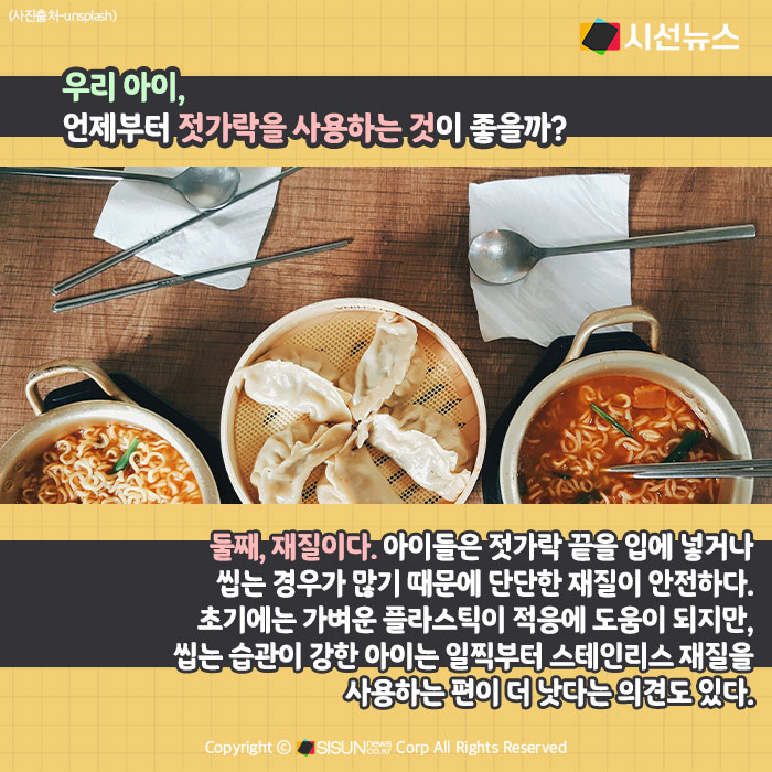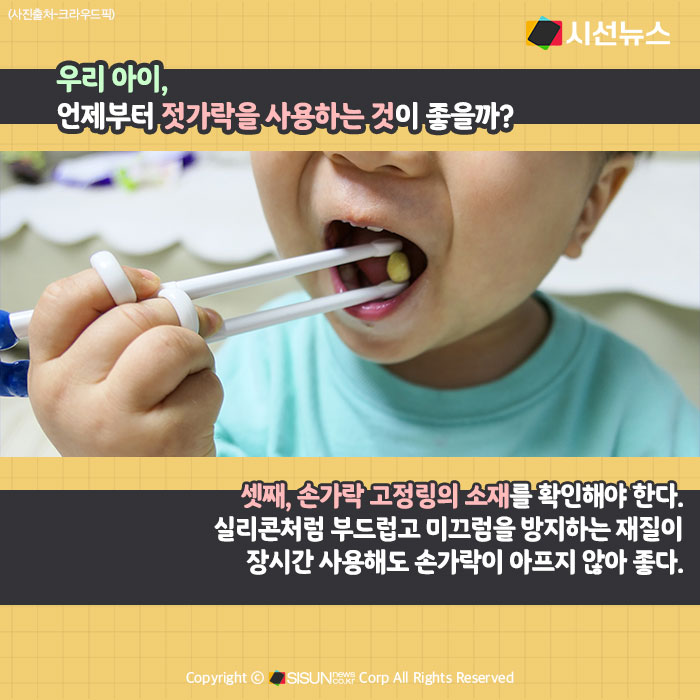 넷째, 음식이 잘 잡히는지를 봐야 한다. 젓가락 끝이 미끄러운 경우 실패 경험이 반복돼 아이가 쉽게 흥미를 잃을 수 있으므로, 끝부분에 미끄럼방지 패턴이나 엠보 처리가 되어있는지 확인하는 것이 필요하다.