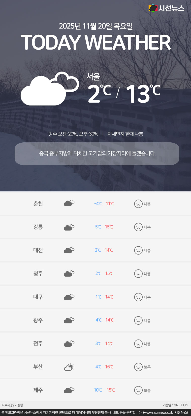 [서울] 최저기온 : 2 / 최고기온 : 13 / 미세먼지 : 한때 나쁨