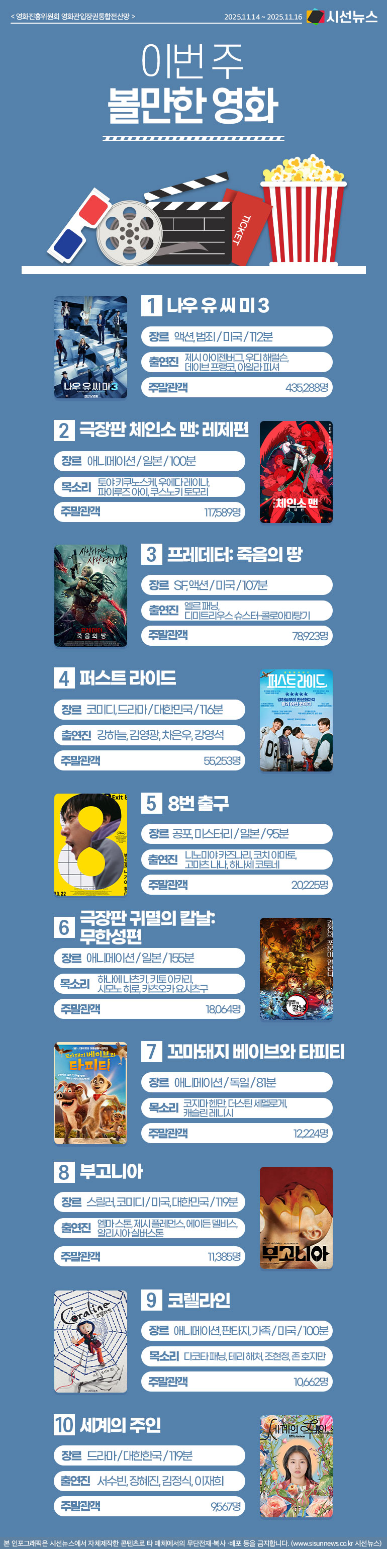 이번 주 볼만한 영화, 어떤 것들이 있을까요? 지난 2025년 11월 14일부터 2025년 11월 16까지 영화진흥위원회 영화관입장권통합전산망의 랭킹을 알려드립니다.