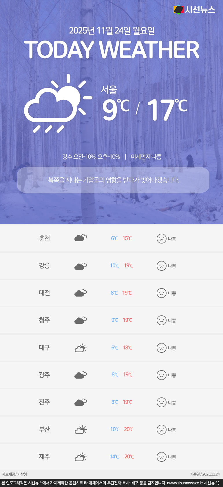 [서울] 최저기온 : 9 / 최고기온 : 17 / 미세먼지 : 나쁨