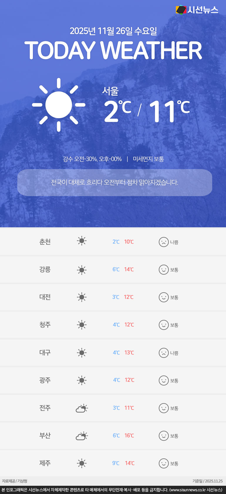 [서울] 최저기온 : 2 / 최고기온 : 11 / 미세먼지 : 보통