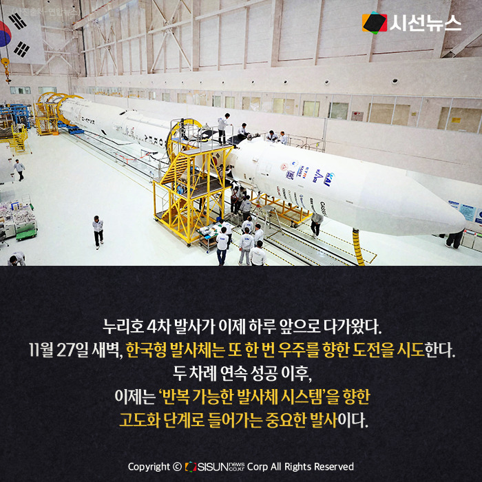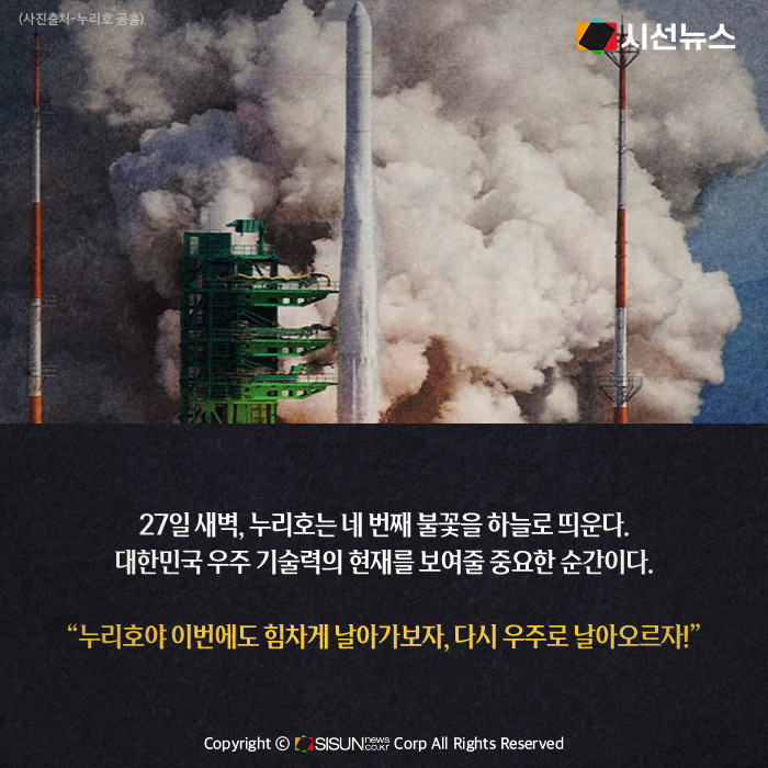 27일 새벽, 누리호는 네 번째 불꽃을 하늘로 띄운다. 한민국 우주 기술력의 현재를 보여줄 중요한 순간이다. “누리호야 이번에도 힘차게 날아가보자, 다시 우주로 날아오르자!”