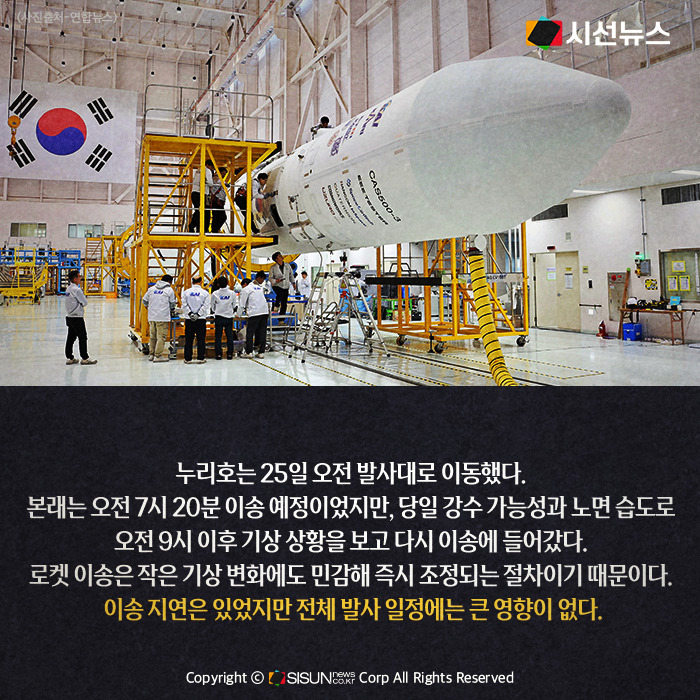 누리호는 25일 오전 발사대로 이동했다. 본래는 오전 7시 20분 이송 예정이었지만, 당일 강수 가능성과 노면 습도 때문에 오전 9시 이후 기상 상황을 보고 다시 이송에 들어갔다. 로켓 이송은 작은 기상 변화에도 민감해 즉시 조정되는 절차이기 때문이다. 이송 지연은 있었지만 전체 발사 일정에는 큰 영향이 없다.
