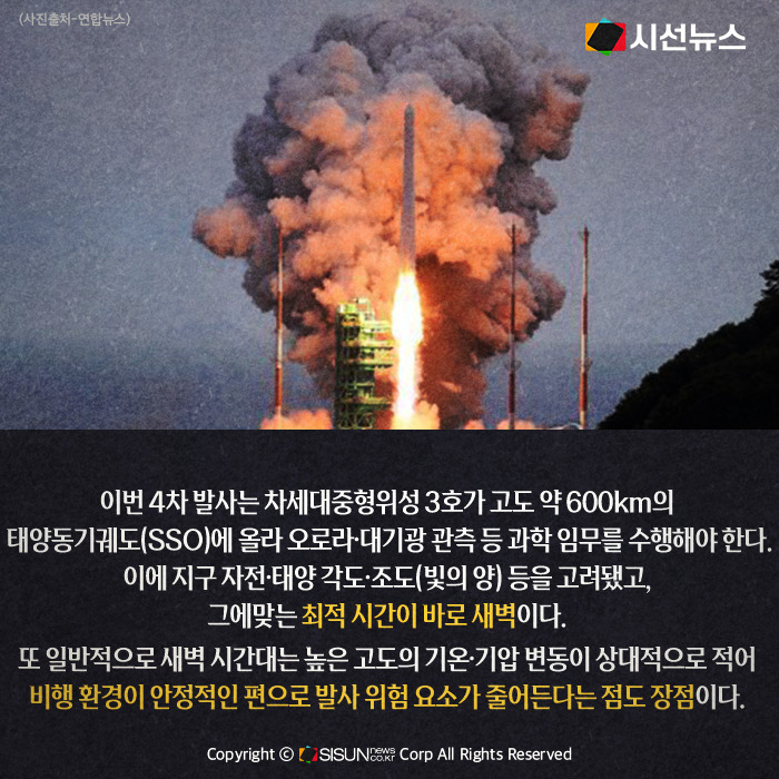 누리호의 발사 시각은 임무 궤도와 위성 관측 조건에 맞춘 과학적 결정이다. 이번 4차 발사는 차세대중형위성 3호가 고도 약 600km의 태양동기궤도(SSO)에 올라 오로라·대기광 관측 등 과학 임무를 수행해야 하기 때문에, 지구 자전·태양 각도·조도(빛의 양) 등을 고려한 최적 시간이 바로 새벽이다. 또한 일반적으로 새벽 시간대는 높은 고도의 기온·기압 변동이 상대적으로 적어 비행 환경이 안정적인 편이어서 발사 위험 요소가 줄어든다는 점도 장점이다. 즉, 새벽 발사는 미적 선택이 아니라 임무와 안전을 위한 과학적 선택이다.