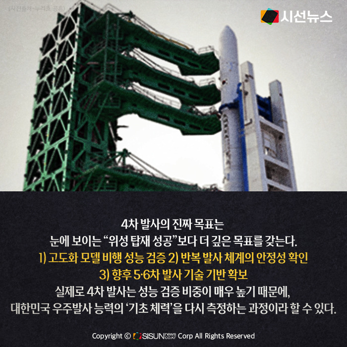 실제로 4차 발사는 성능 검증 비중이 매우 높기 때문에, 대한민국의 우주발사 능력의 ‘기초 체력’을 다시 측정하는 과정이라고 할 수 있다.