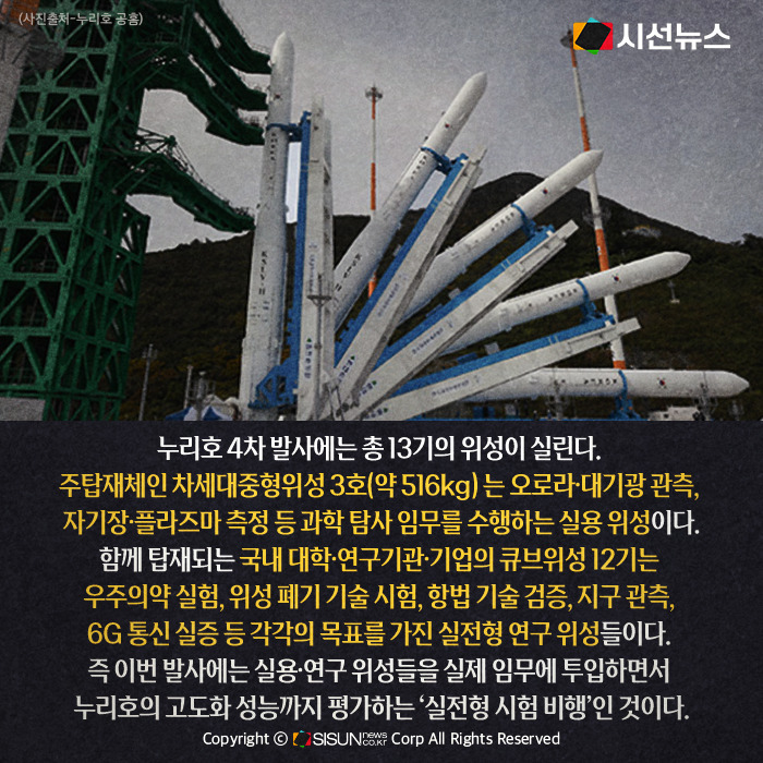 누리호 4차 발사에는 총 13기의 위성이 실린다. 주탑재체인 차세대중형위성 3호(약 516kg) 는 오로라·대기광 관측, 자기장·플라즈마 측정 등 과학 탐사 임무를 수행하는 실용 위성이다. 함께 탑재되는 국내 대학·연구기관·기업의 큐브위성 12기는 우주의약 실험, 위성 폐기 기술 시험, 항법 기술 검증, 지구 관측, 6G 통신 실증 등 각각의 목표를 가진 실전형 연구 위성들이다. 따라서 이번 4차 발사는 단순 검증 비행이 아니라, 실용·연구 위성들을 실제 임무에 투입하면서 누리호의 고도화 성능까지 평가하는 ‘실전형 시험 비행’이다.