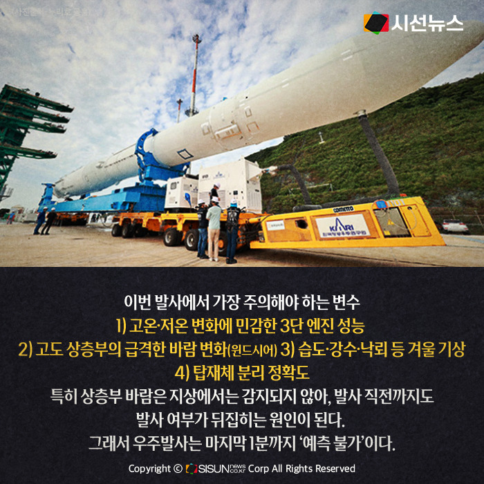 이번 발사에서 가장 주의해야 하는 변수는 ①고온·저온 변화에 민감한 3단 엔진 성능 ②고도 상층부의 급격한 바람 변화(윈드시어) ③습도·강수·낙뢰 등 겨울 기상 ④탑재체 분리 정확도 특히 상층부 바람은 지상에서는 감지되지 않아, 발사 직전까지도 발사 여부가 뒤집히는 원인이 된다. 그래서 우주발사는 마지막 1분까지 ‘예측 불가’이다.