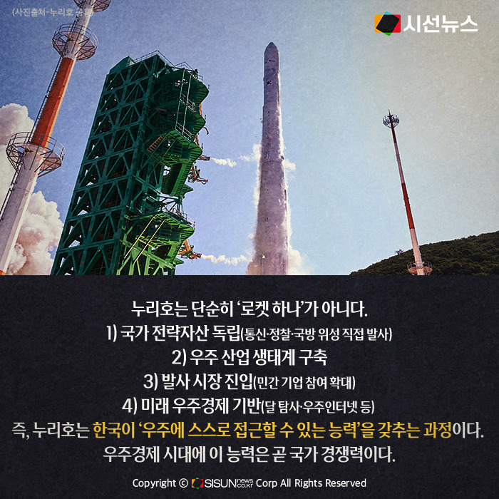 누리호는 단순히 ‘로켓 하나’가 아니다. 국가 전략자산 독립(통신·정찰·국방 위성 직접 발사), 우주 산업 생태계 구축, 발사 시장 진입(민간 기업 참여 확대), 미래 우주경제 기반(달 탐사·우주인터넷 등)의 의미가 있다. 즉, 누리호는 한국이 ‘우주에 스스로 접근할 수 있는 능력’을 갖추는 과정이며 우주경제 시대에 이 능력은 곧 국가 경쟁력이다.